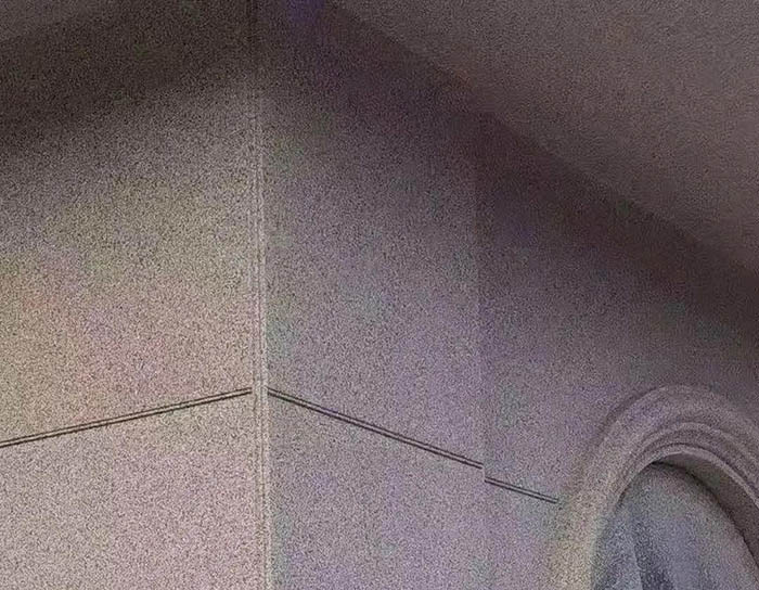 為了讓多彩涂料噴涂效果更接近石材,原則上可采用與石材一樣的分格,比如陰陽角分格、窗口分格、樓沿分格。但考慮到石材的局限性,水包砂分格可以不用在陰陽角部位進行分格,建議可在窗口側(cè)面必須進行分格,并注意盡量不要出現(xiàn)小塊、小邊的現(xiàn)象。